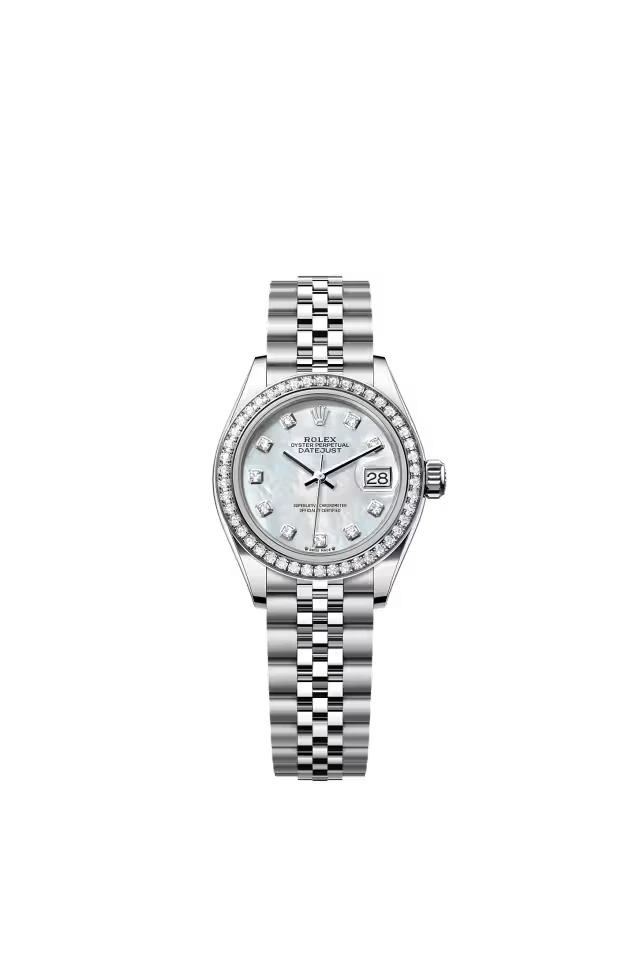 This Oyster Perpetual Datejust 31 in Oystersteel and white gold features a white mother-of-pearl, diamond-set dial and a Jubilee bracelet.