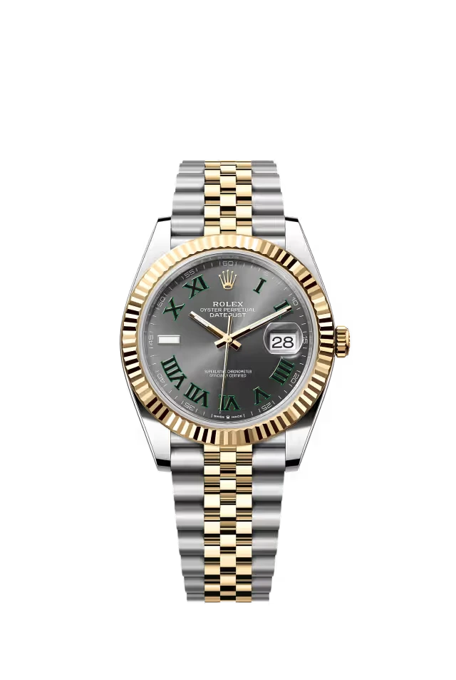 This Oyster Perpetual Datejust 41 in Oystersteel and yellow gold features a slate dial and a Jubilee bracelet.