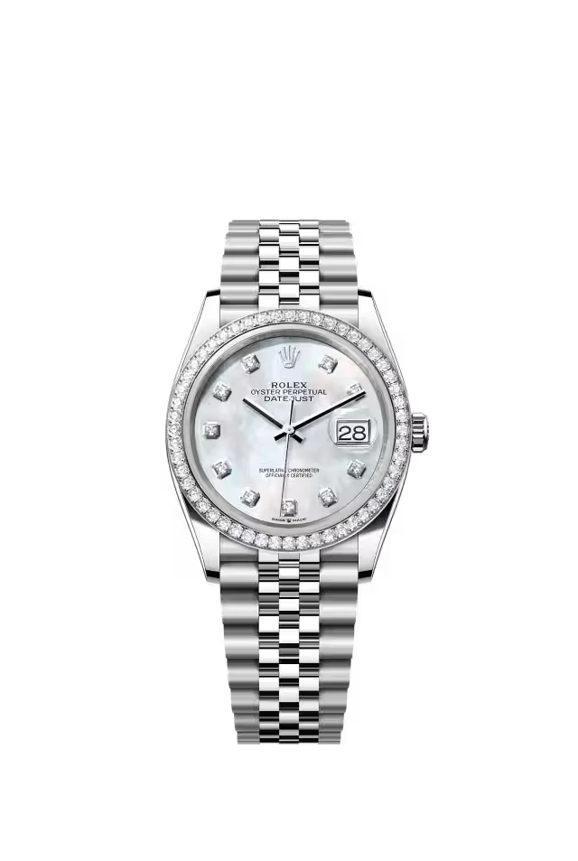 This Oyster Perpetual Datejust 36 in Oystersteel and white gold features a white mother-of-pearl, diamond-set dial and a Jubilee bracelet.