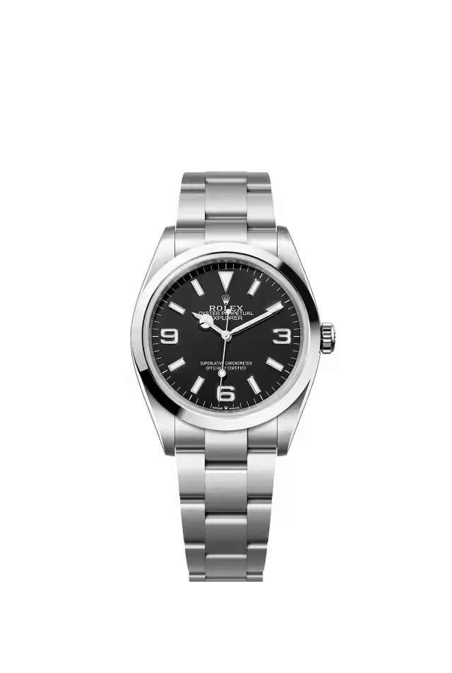 The Oyster Perpetual Explorer 36 Oystersteel features a distinctive black dial with characteristic 3, 6, and 9 numerals with a Chromalight display.