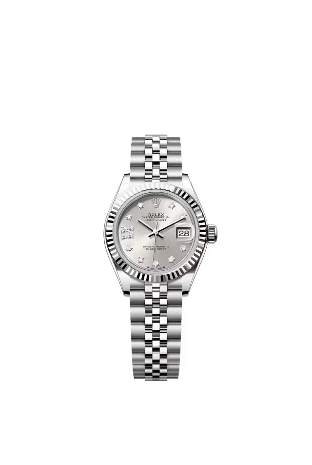 This Oyster Perpetual Lady-Datejust in Oystersteel and white gold features a silver, diamond-set dial and a Jubilee bracelet.