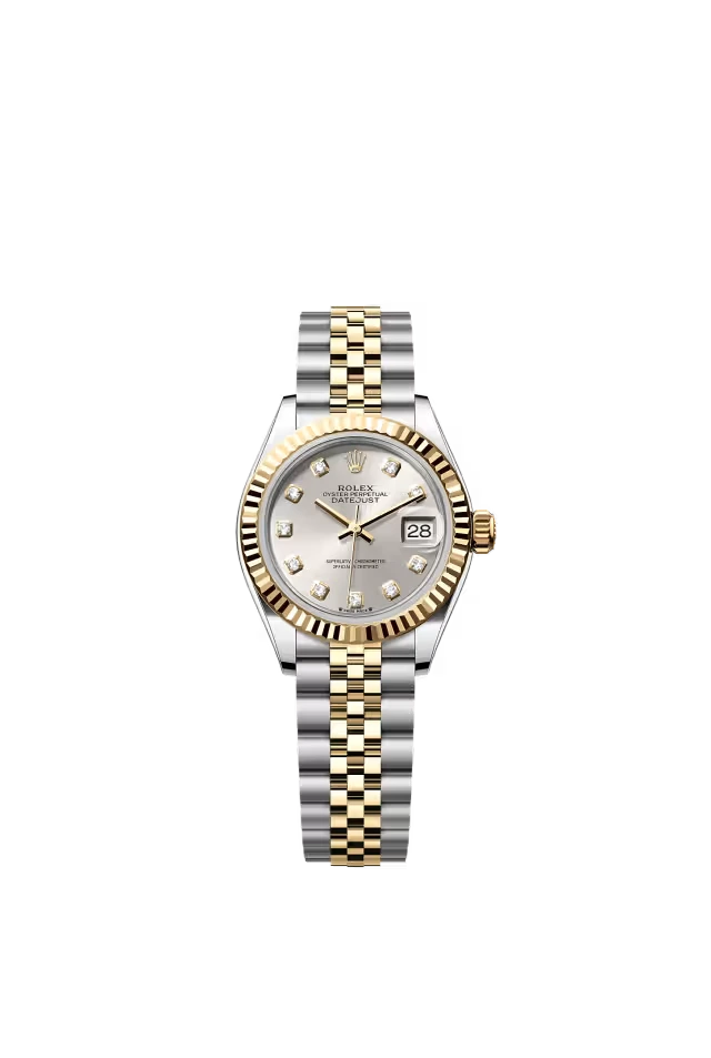 This Oyster Perpetual Datejust 28 in Oystersteel and yellow gold features a silver, diamond-set dial and a Jubilee bracelet.
