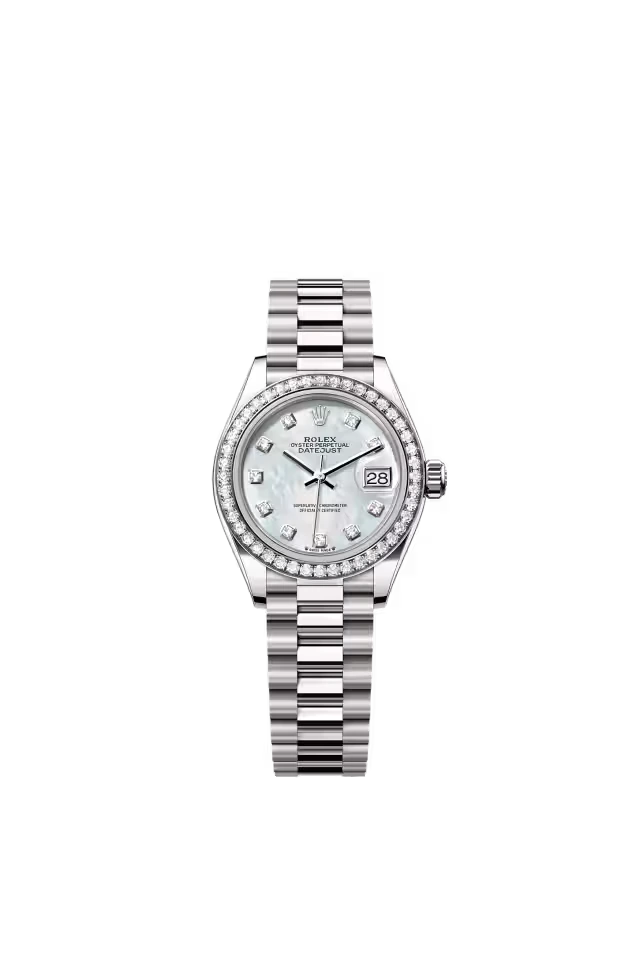 This Oyster Perpetual Lady-Datejust in 18 ct white gold features a white mother-of-pearl, diamond-set dial and a President bracelet.