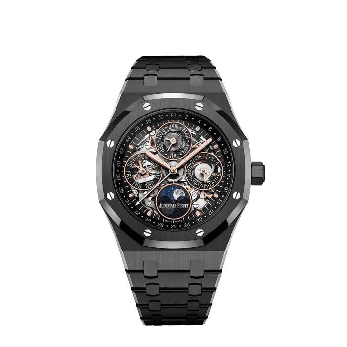 A feat of technical mastery, the Royal Oak Perpetual Calendar Openworked dresses the artistic openworked sapphire dial and the movement’s visible pink gold components in black ceramics.